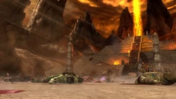 | Se aprecian los Helicópteros persiguiendo Dragones y el trono de Shao Kahn. Las estatuas de gárgolas vuelven a decir presente. | ||